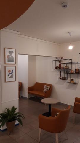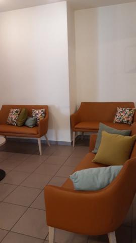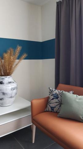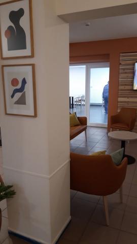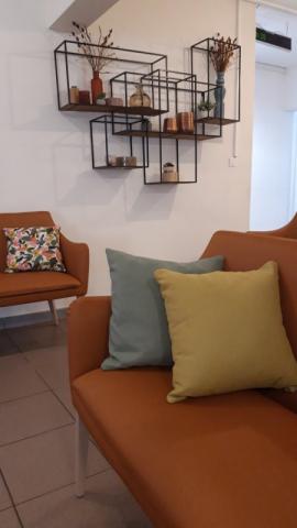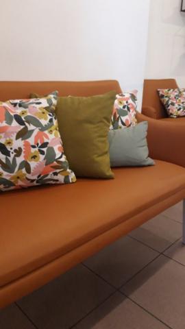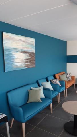 Pour ce faire nous sommes partis des coloris déjà sélectionnés du hall d'accueil. Nous avons choisis de jolies teintes assorties pour fondre les canapés orangés dans le décor.