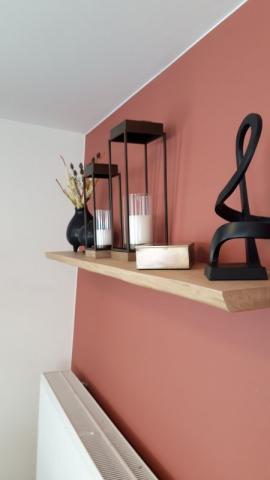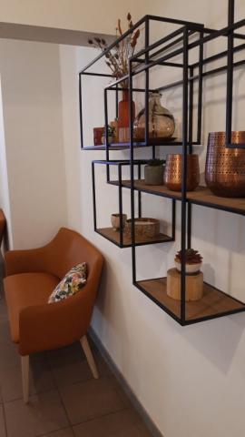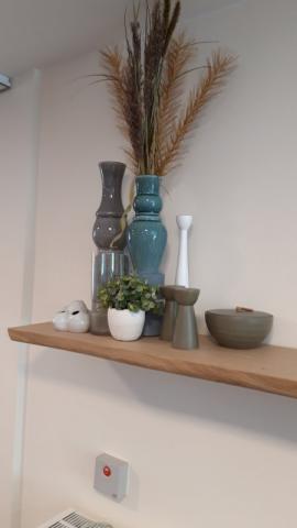 Nous avons sélectionné une série de "beaux objets " que nous avons placés dans une belle étagère destructurée ceci afin de meubler l'espace mur.