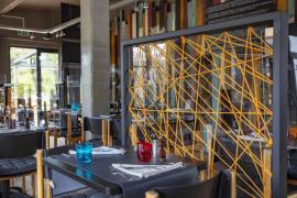 Il nous a également été demandé de réaliser des claustras (séparation entre les tables). Les consignes claires: léger, amovible et coloré. Me basant sur le décor actuel et me basant sur le lambris peint, j'ai inventé une structure en métal noire dans laquelle on a fait passer de manière aléatoire des cordes de couleur assortie au lambris.