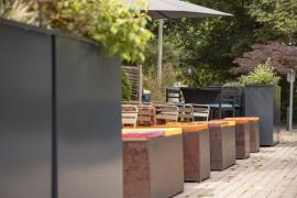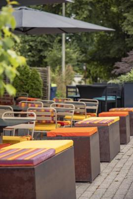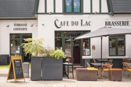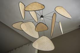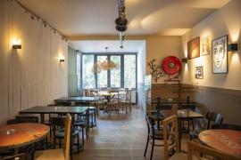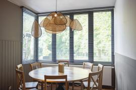 Pour ce projet, il s'agissait de rendre l'espace "café" plus cosy : c'est ce que l'on a fait en changeant les appliques murales et en habillant les fenêtres de stores vénitiens.